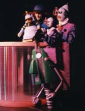 | 1991 - "Les yeux de la nuit" Cie Le Bruit qui court C'était ma première mise en scène de spectacle. Ici j'ai réalisé une dizaine de marionnettes à tiges - inspiré par les marionnettes indonésienne dite "wayang golek" - pour la plupart et de type marotte. Fabrication en mousse sculptée. Finission au latex et peinture. | | ![]() |